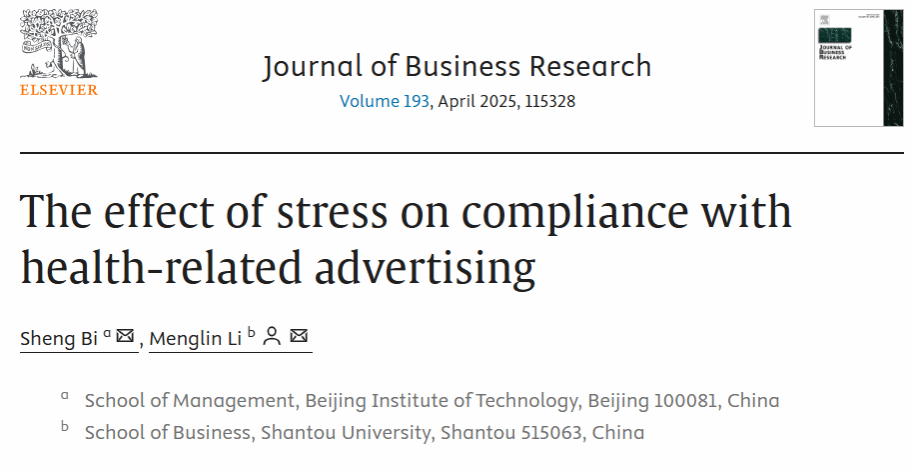 李梦琳博士以通讯作者身份与北京理工大学管理与经济学院市场营销系助理教授毕圣合作完成的学术论文The effect of stress on compliance with health-related advertising被中科院一区期刊Journal of Business Research接受并在线发表。