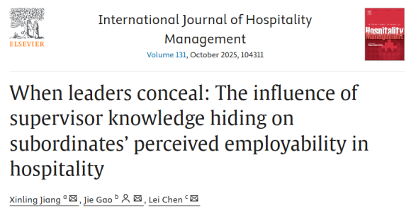 1. 青年教师蒋新玲博士论文成果:When leaders conceal: The influence of supervisor knowledge hiding on subordinates’ perceived employability in hospitality