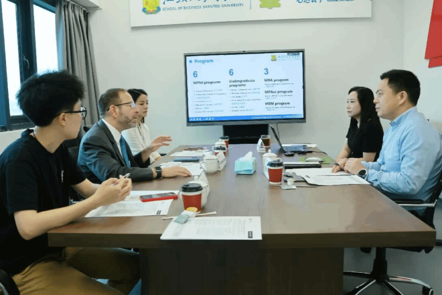 On May 8, 2025, a delegation from Yeshiva University (YU) in the United States visited the East Coast Campus of the School of Business Shantou University to engage in discussions regarding a joint bachelor-master degree program. The visiting delegation from Yeshiva University included Mordechai Cohen, Director of the Sino-Judaic Dialogue Project and Professor of Jewish Philosophy, along with project communication specialists Jingyuan Wang and Weizhi Ye. Professor Liang Qiang, Dean of the School attended the symposium.