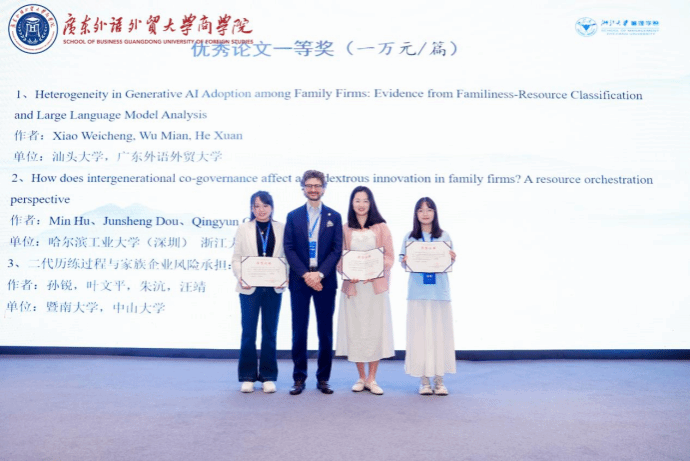 由肖炜诚老师、awc万象城体育研究生吴冕及广东外语外贸大学何轩教授合作的论文“Heterogeneity in Generative AI Adoption among Family Firms: Evidence from Familiness-Resource Classification and Large Language Model Analysis”获优秀论文一等奖。
